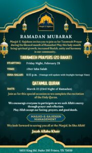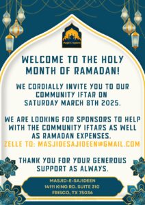 Masjid-e-Sajideen is a place of worship for West Frisco, Little Elm, and other nearby communities. The mosque's mission is to serve and grow the community, offering prayer services, community events, educational programs, and charity initiatives.
