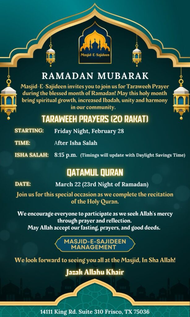 Masjid E Sajideen invites you to join us in the blessings of Ramadan! May this holy month bring spiritual growth, increased Ibadah, and unity and harmony in our community.